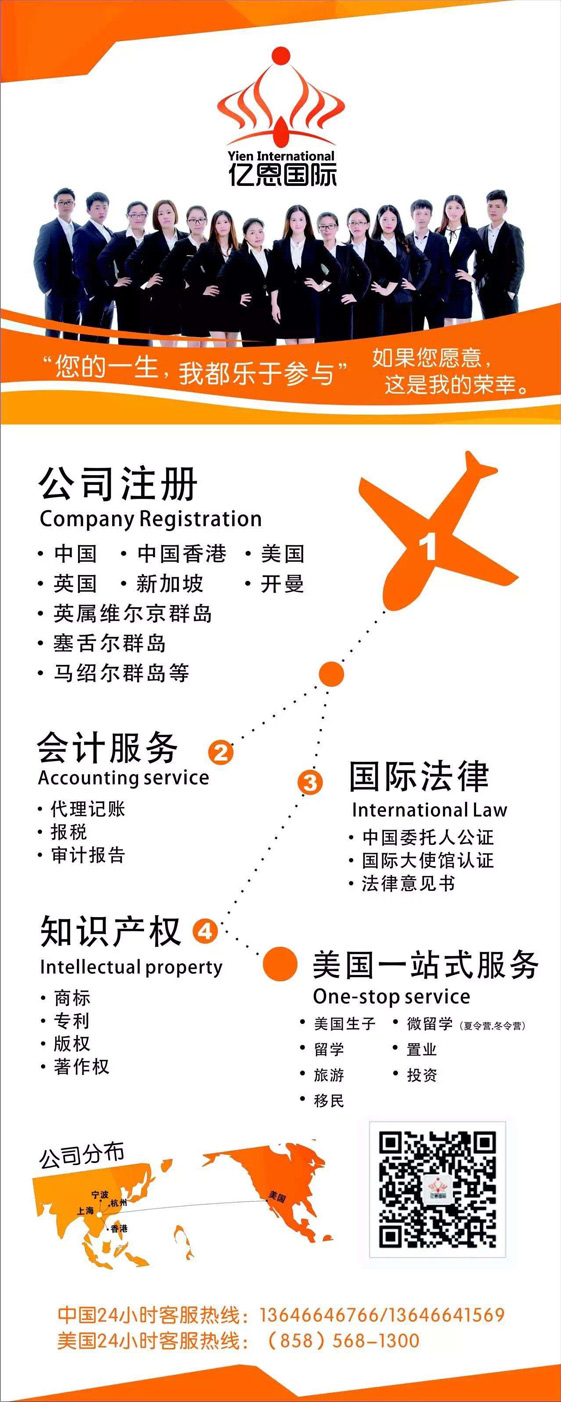 億恩國際顧問有限公司專業(yè)代理注冊香港、英國、美國、新加坡、英屬維爾京(BVI)群島、馬紹爾群島等海外公司;專業(yè)代理中國及海外知識產(chǎn)權(quán):商標(biāo)、專利,版權(quán)、海關(guān)備案等服務(wù)。我們擁有多年的實際操作經(jīng)驗、專業(yè)過硬。我們具有充分的條件為客戶的各種需求提供多元化全面的商業(yè)及進(jìn)出口、銀行等咨詢服務(wù)。
