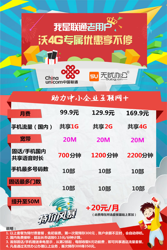 中國(guó)聯(lián)通•智慧沃企,是一款為商鋪、企業(yè)通信量身定做的產(chǎn)品,十分適合中小型企業(yè),寬帶可提升至50M,套餐內(nèi)固話/手機(jī)共享語(yǔ)音和流量,價(jià)格優(yōu)惠,通信便捷,服務(wù)有保證。